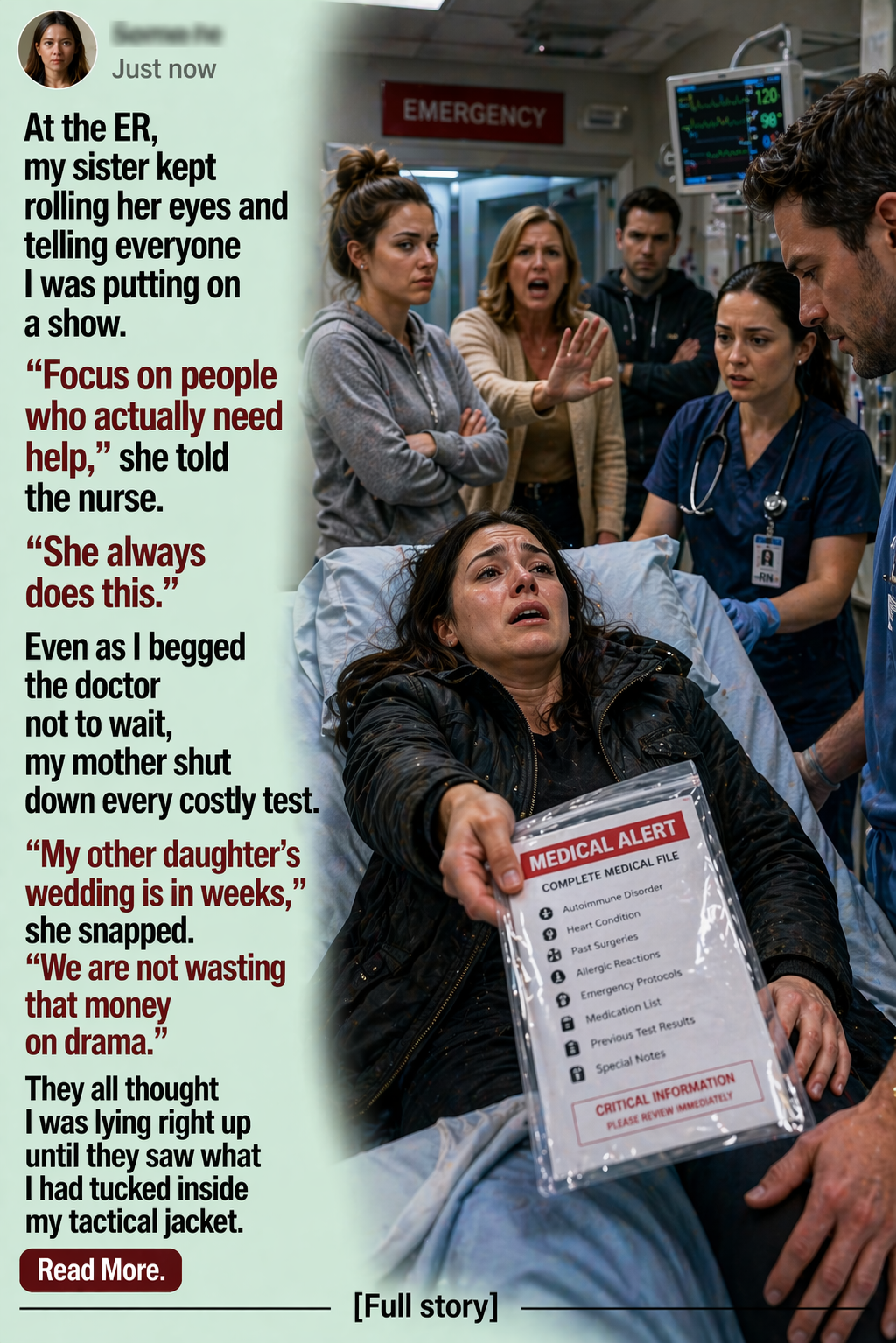At the ER, my sister kept rolling her eyes and telling everyone I was putting on a show. “Focus on people who actually need help,” she told the nurse. “She always does this.” Even as I begged the doctor not to wait, my mother shut down every costly test. “My other daughter’s wedding is in weeks,” she snapped. “We are not wasting that money on drama.” They all thought I was lying right up until they saw what I had tucked inside my tactical jacket.