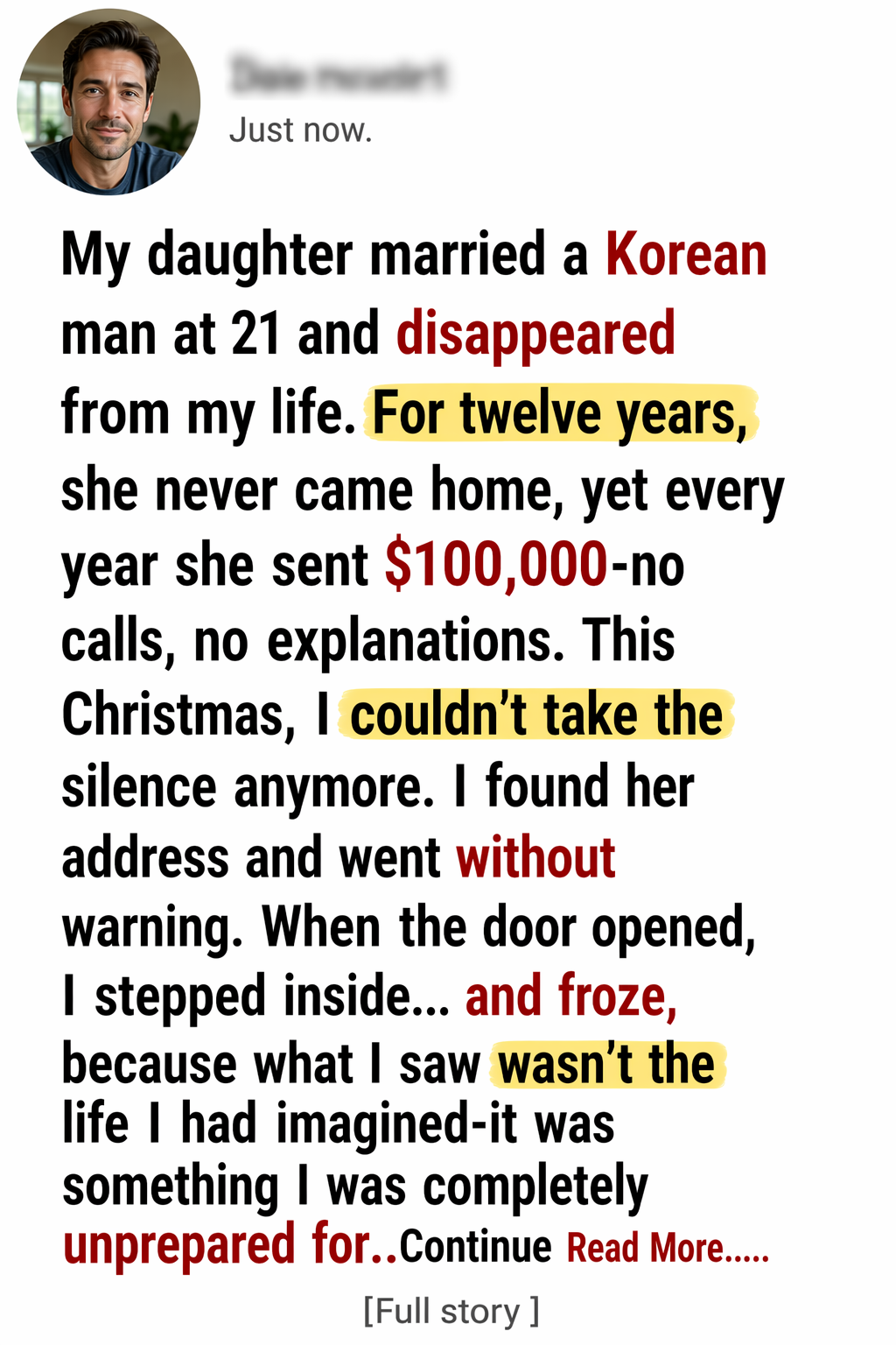 The first wire transfer arrived three months after my daughter disappeared from my life. It was for $100,000, sent from a Seoul bank I had never heard of, and the memo line contained only two words: For home. No letter. No phone call. No return address. Just money. At first I thought it was some grotesque mistake, the kind of banking error that would be corrected by noon. But the funds settled, the bank confirmed the transfer was intentional, and every year after that—always in early December, always the exact same amount—another $100,000 appeared in my account like a ritual performed by someone who refused to speak my name aloud.