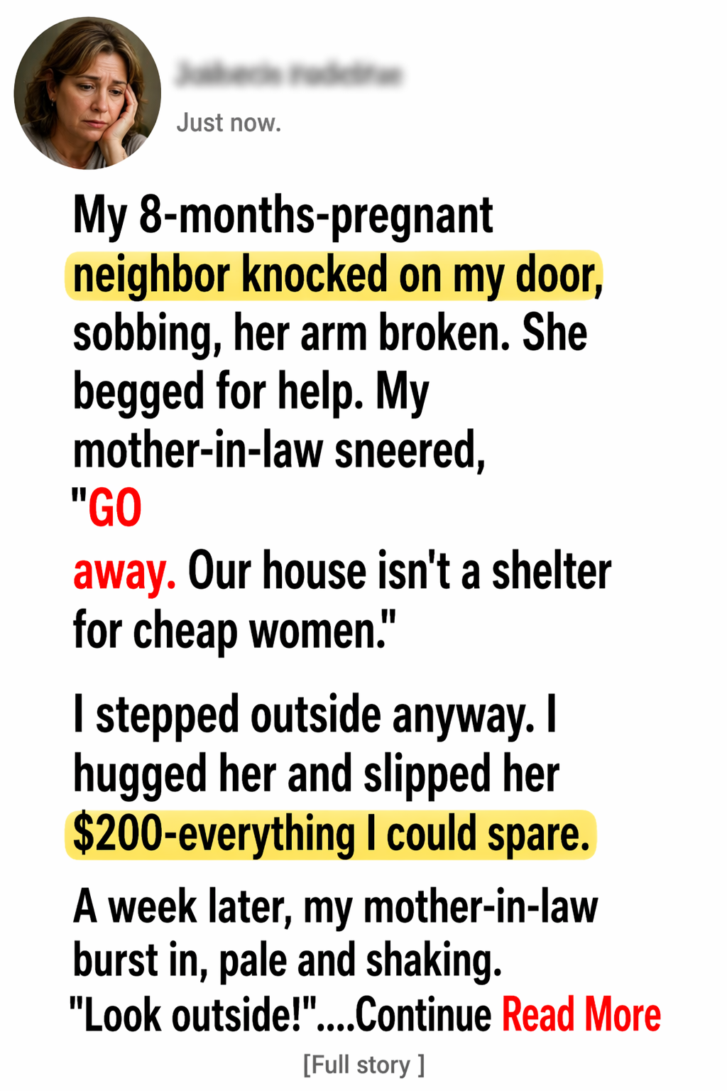 My 8-months-pregnant neighbor knocked on my door, sobbing, her arm broken. She begged for help. My mother-in-law sneered, “Go away. Our house isn’t a shelter for cheap women.”