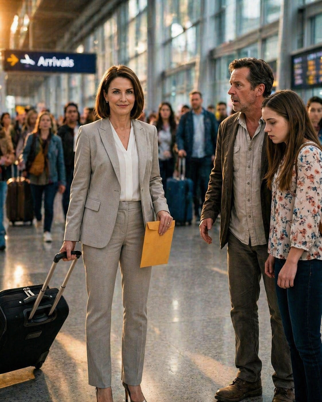 I had just stepped off the plane, my suitcase still in my hand, when I halted so abruptly that the man behind me grumbled. Across the arrivals area, under a glowing airline sign and surrounded by travelers hauling bags and embracing loved ones, stood my husband, Daniel. His arm circled his secretary, Melissa, with a familiarity that didn’t belong to confusion. She leaned into him, smiling as if she fully belonged there. Then Daniel lifted his gaze and saw me.