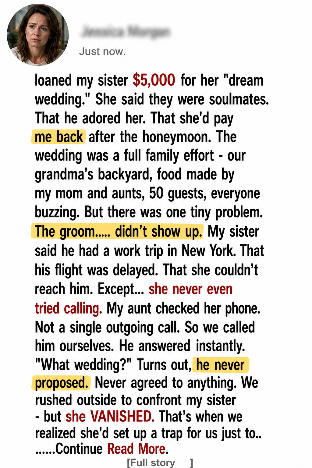 “Hi,” I said, forcing calm into my voice. “We’re at the wedding. Everyone’s waiting. Where are you?”