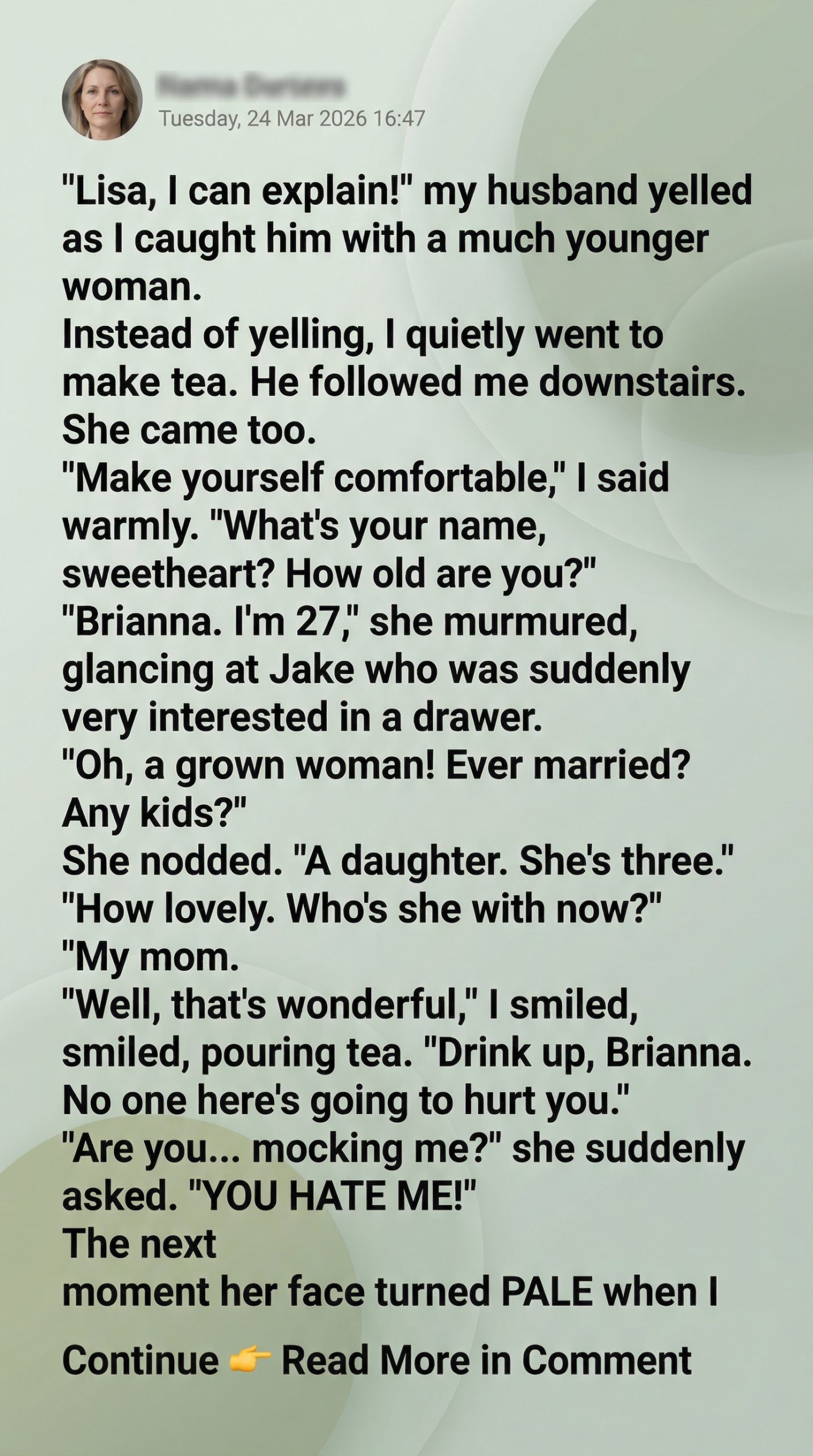 Lisa came home early and found her husband in bed with a woman half her age, but instead of screaming, she offered them tea. What followed left the mistress pale and Jake reeling. Because Lisa wasn’t shocked… she was prepared.The house was too quiet when I arrived home after my conference ended early. The kind of quiet that makes your skin prickle and your stomach drop. I set my keys down on the kitchen counter, and that’s when I heard a creak from upstairs. I slipped my heels off and padded up the stairs. The guest bedroom door was ajar, and the sound of voices murmuring filtered through into the hall. That’s when I stopped trying to be quiet. I threw the door open, giving my husband and the young woman in bed with him the fright of their lives.“Lisa, I can explain!” Jake stammered, scrambling to his feet like a teenager caught sneaking out. His voice cracked on my name. But I didn’t even flinch. Why would I? I’d been expecting this moment for years.