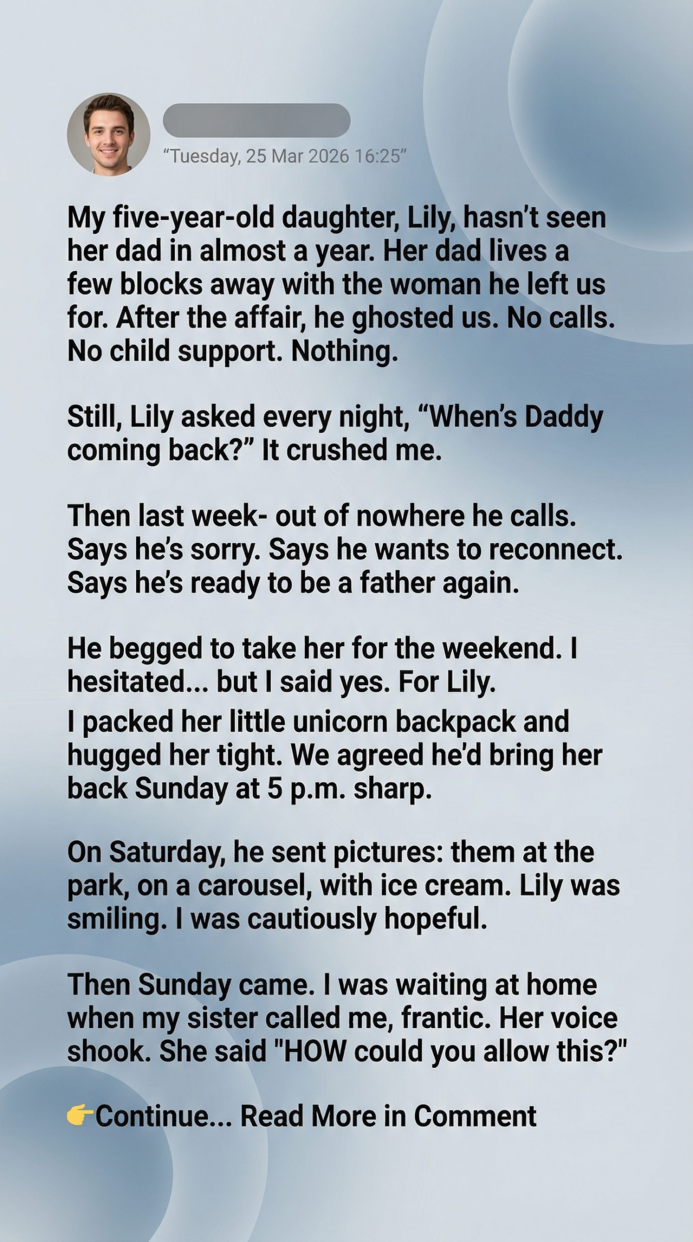 Then, three months ago, the message came. A simple text. “Hey. Been thinking a lot about [Daughter’s name]. I want to be a dad to her. Really be there.”My stomach lurched. Seriously? Now? After a decade of fleeting birthday calls, missed Christmas visits, and always, always an excuse. I almost deleted it. I almost blocked him. But then, I looked at her. My beautiful, bright girl, who sometimes still looked wistfully at the other kids with their dads at school events. A tiny, dangerous flicker of hope ignited within me. Maybe, just maybe, he’d changed. Maybe this was real.