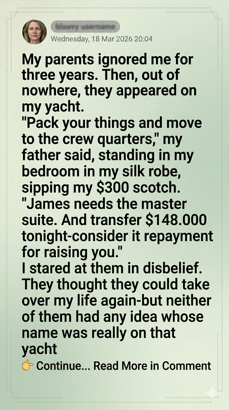 My parents ignored me for three years. Then one day they suddenly appeared on my yacht. “Pack your things and move to the crew quarters,” my father said, standing in my bedroom wearing my silk robe and sipping my $300 scotch. “James needs the master suite. And transfer $148,000 tonight—think of it as paying us back for raising you.”