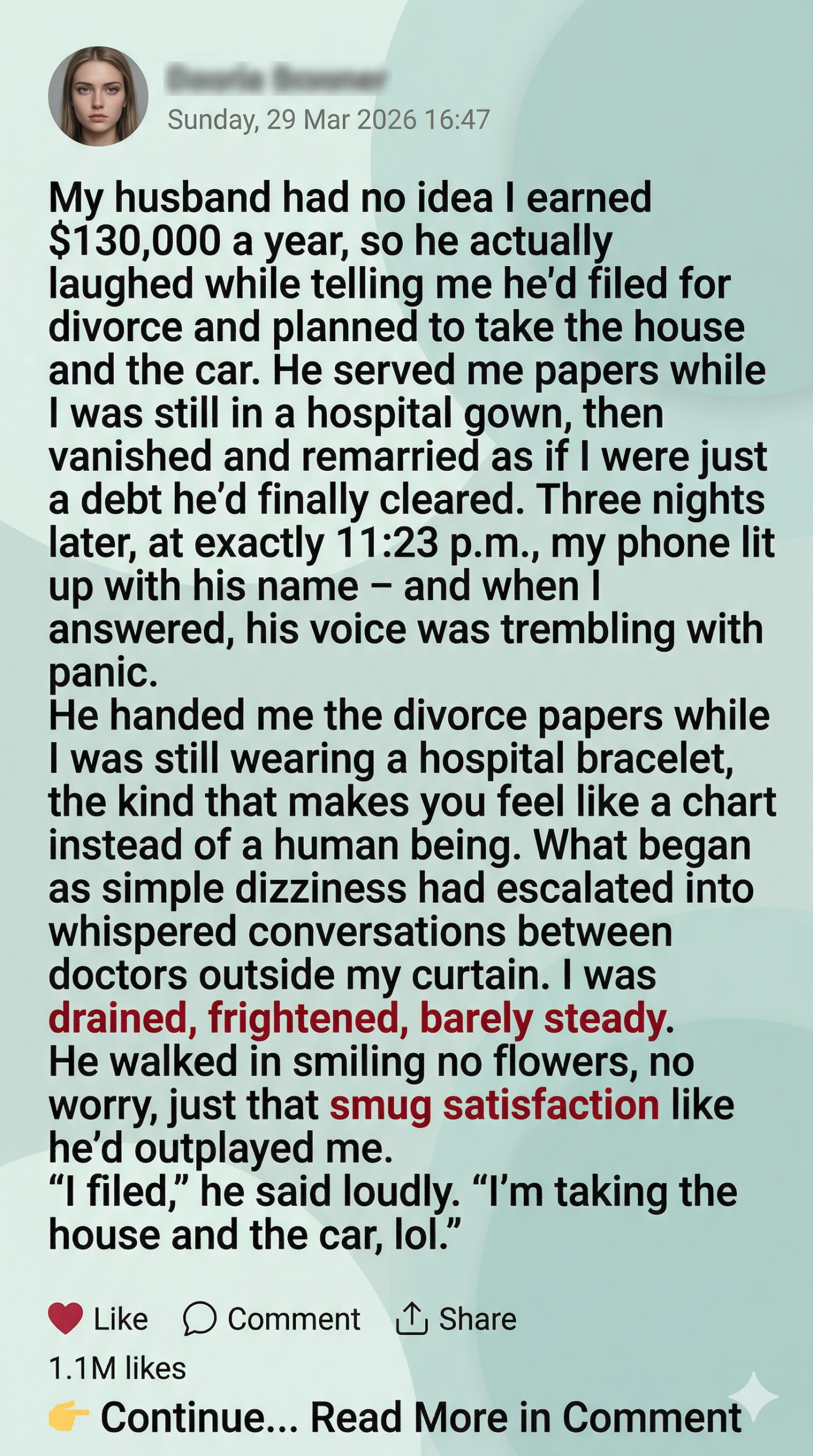 My husband had no idea I earned $130,000 a year, so he actually laughed while telling me he’d filed for divorce and planned to take the house and the car. He served me papers while I was still in a hospital gown, then vanished and remarried as if I were just a debt he’d finally cleared. Three nights later, at exactly 11:23 p.m., my phone lit up with his name — and when I answered, his voice was trembling with panic. He handed me the divorce papers while I was still wearing a hospital bracelet, the kind that makes you feel like a chart instead of a human being. What began as simple dizziness had escalated into whispered conversations between doctors outside my curtain. I was drained, frightened, barely steady. He walked in smiling — no flowers, no worry, just that smug satisfaction like he’d outplayed me. “I filed,” he said loudly. “I’m taking the house and the car, lol.” He laughed like it was a joke, then dropped a manila envelope on my lap. Everything was already signed on his end, highlighted where I was supposed to comply — like I was just paperwork waiting to be processed. I read the words as my heart pounded. House. Car. Accounts. He’d marked them off like a shopping list. The shocking part wasn’t that he wanted it all — it was how convinced he was that I couldn’t stop him. Because he didn’t know I made $130,000 a year. For years, he treated my career like a side hobby. He preferred the quiet version of me — dependable, bill-paying, non-threatening. I never corrected him about my income. I didn’t need to. I kept my earnings separate, built savings quietly, and watched him spend as if consequences were optional. He leaned in, voice