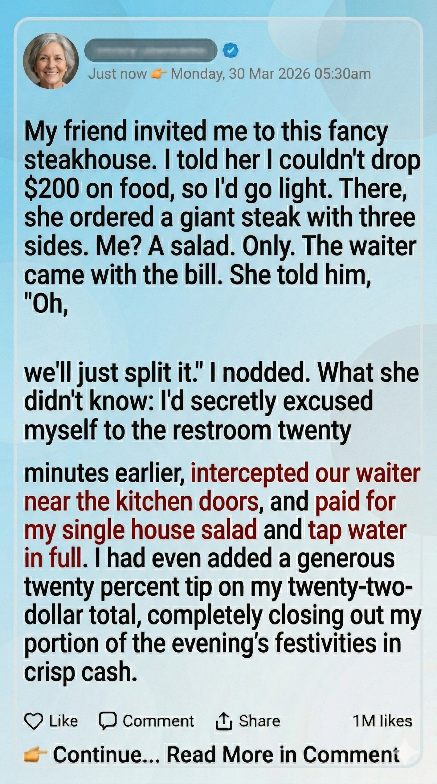 My friend invited me to this fancy steakhouse. I told her I couldn’t drop $200 on food, so I’d go light. There, she ordered a giant steak with three sides. Me? A salad. Only. The waiter came with the bill. She told him, “Oh, we’ll just split it.” I nodded. What she didn’t know: I’d secretly excused myself to the restroom twenty minutes earlier, intercepted our waiter near the kitchen doors, and paid for my single house salad and tap water in full. I had even added a generous twenty percent tip on my twenty-two-dollar total, completely closing out my portion of the evening’s festivities in crisp cash. The black, leather-bound checkbook currently resting on the pristine white tablecloth didn’t contain our combined total. It contained hers, and hers alone.