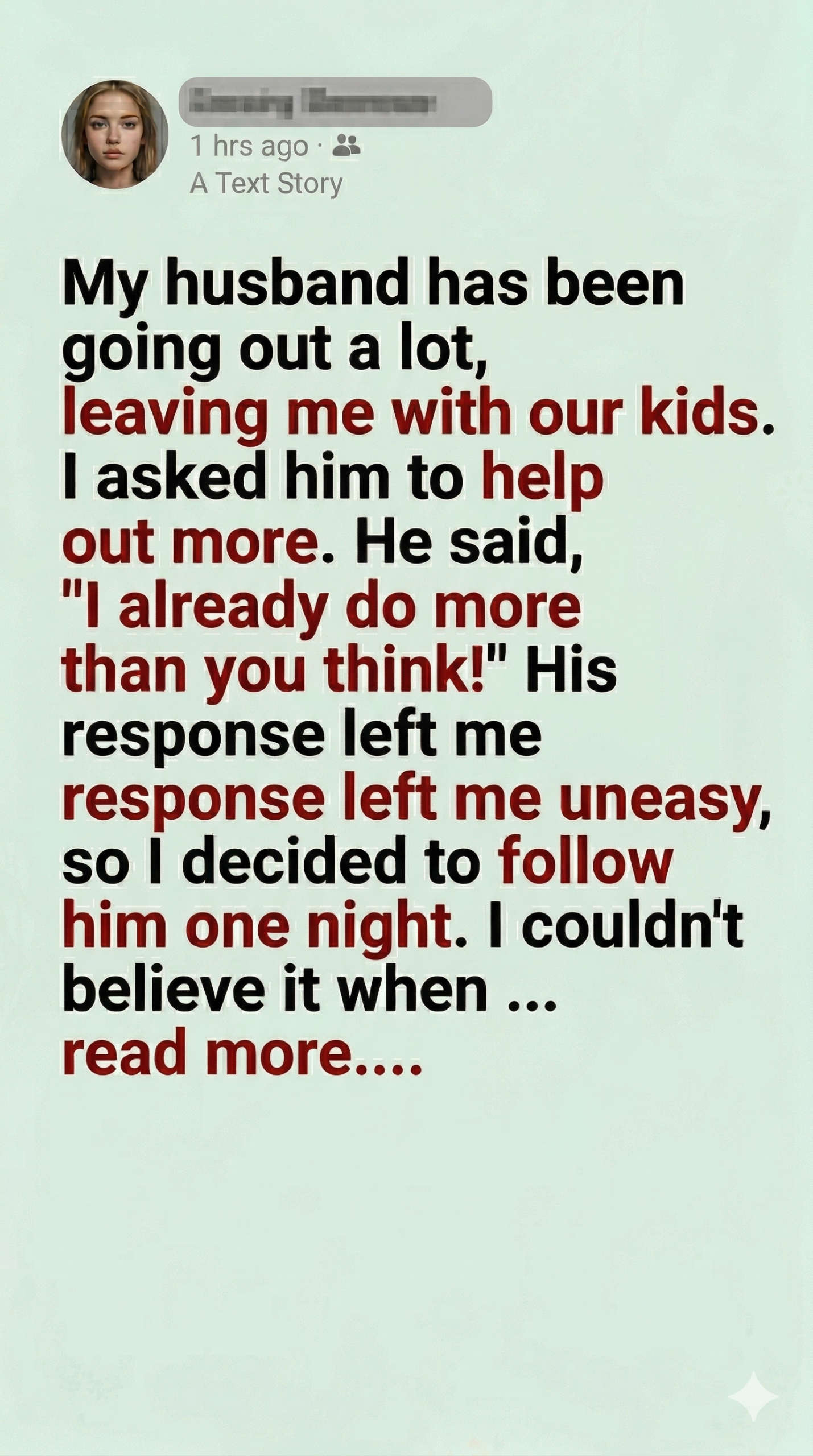 He’d say he was meeting an old friend for coffee, then come home three hours later smelling like cold air and takeout. He’d claim he had to “run an errand” after work and wouldn’t return until bedtime, just in time to kiss the kids on the forehead and collapse onto the couch like he’d carried the weight of the world all day.