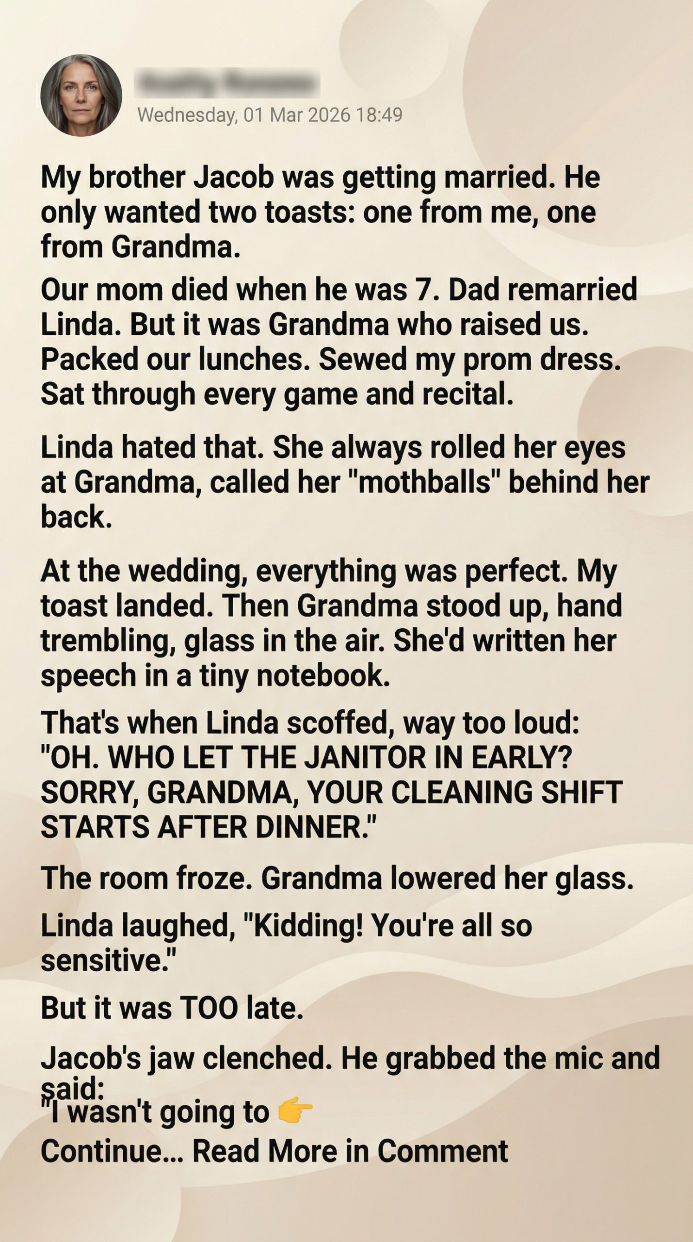As for Grandma, she never bragged about what happened. Never retold it for attention. When relatives brought it up, she would just smile faintly and say, “I do hope Linda learns to be kinder.”