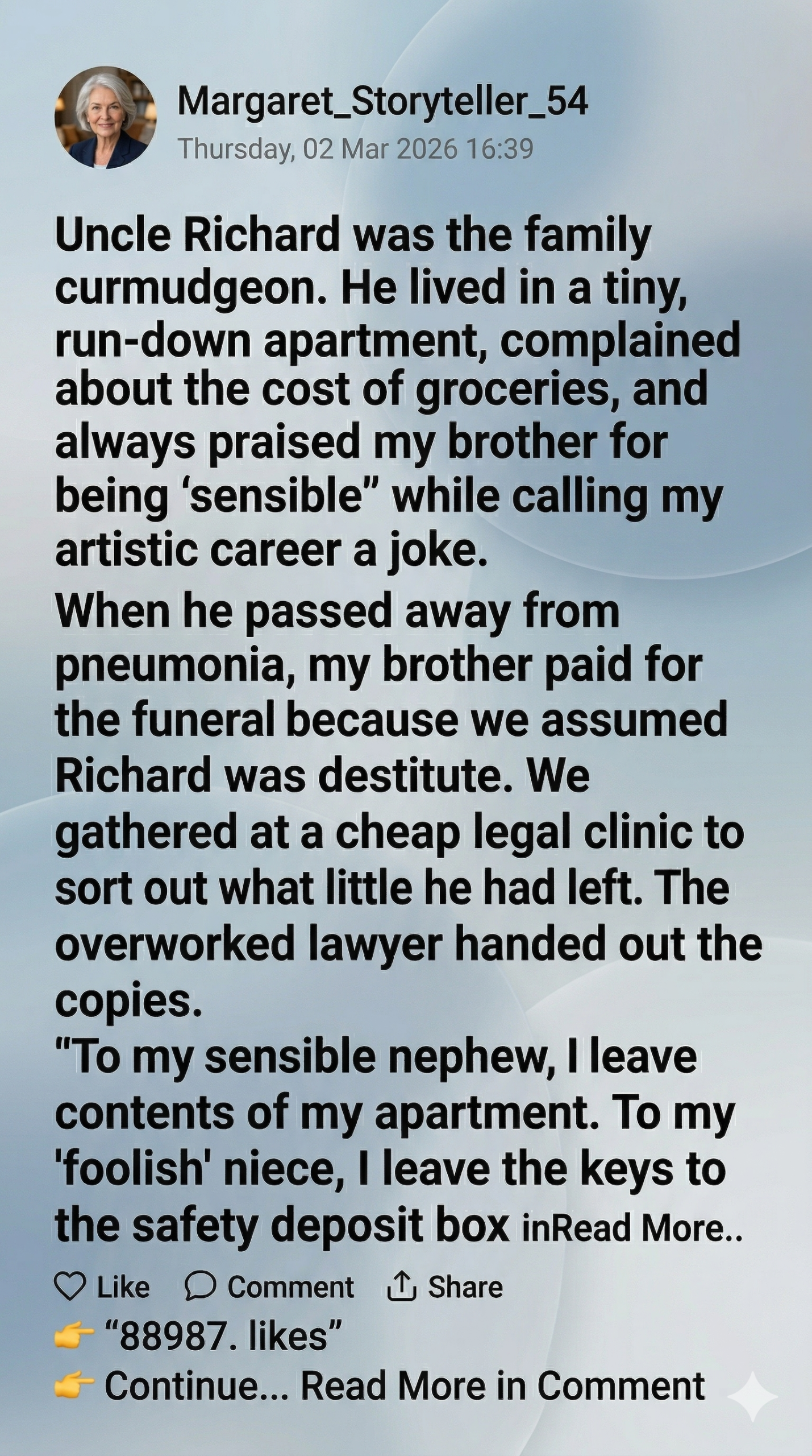He lived in a tiny, run-down apartment, complained constantly about grocery prices, and never missed a chance to praise my brother for being “sensible” while calling my artistic career a joke.