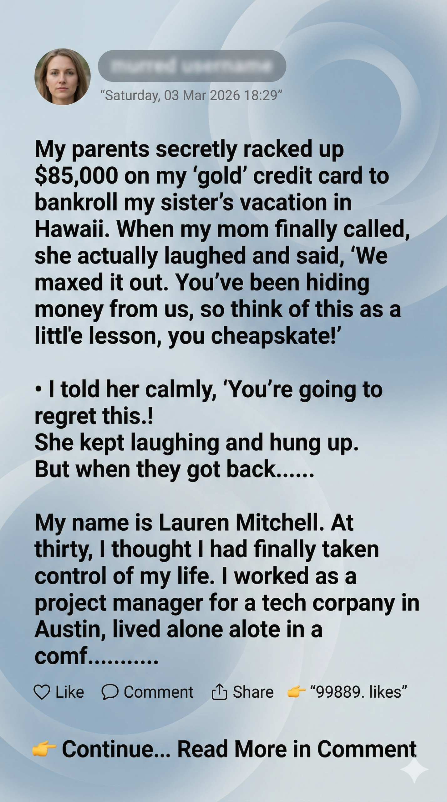 “My parents secretly racked up $85,000 on my ‘gold’ credit card to bankroll my sister’s vacation in Hawaii. When my mom finally called, she actually laughed and said, ‘We maxed it out. You’ve been hiding money from us, so think of this as a little lesson, you cheapskate.’ I told her calmly, ‘You’re going to regret this.’ She kept laughing and hung up. But when they got back…”