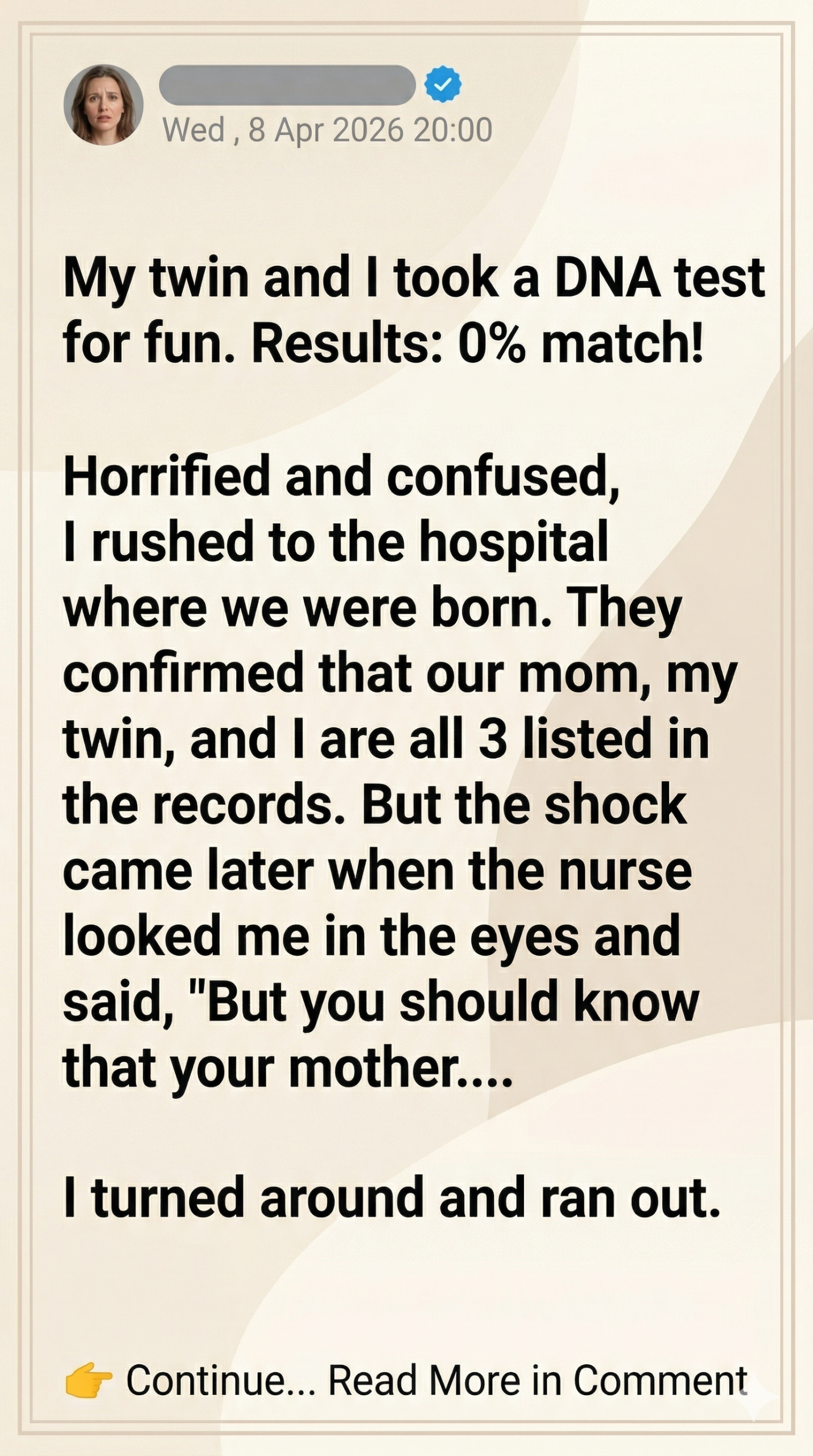 The world tilted. The air left my lungs. My twin sister, the girl I had shared every moment of my life with, the one I had called my mirror, my other half… didn’t share a biological father with me. WE WERE NOT FULL SIBLINGS. We were half-siblings, at best, sharing only our mother.