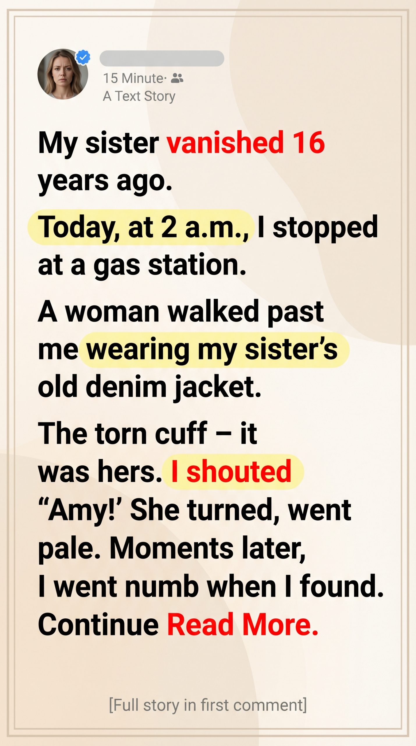My sister Amy vanished when we were teenagers. No note. No explanation. Just an empty room and the denim jacket she always wore—the one with the frayed cuff she refused to fix.