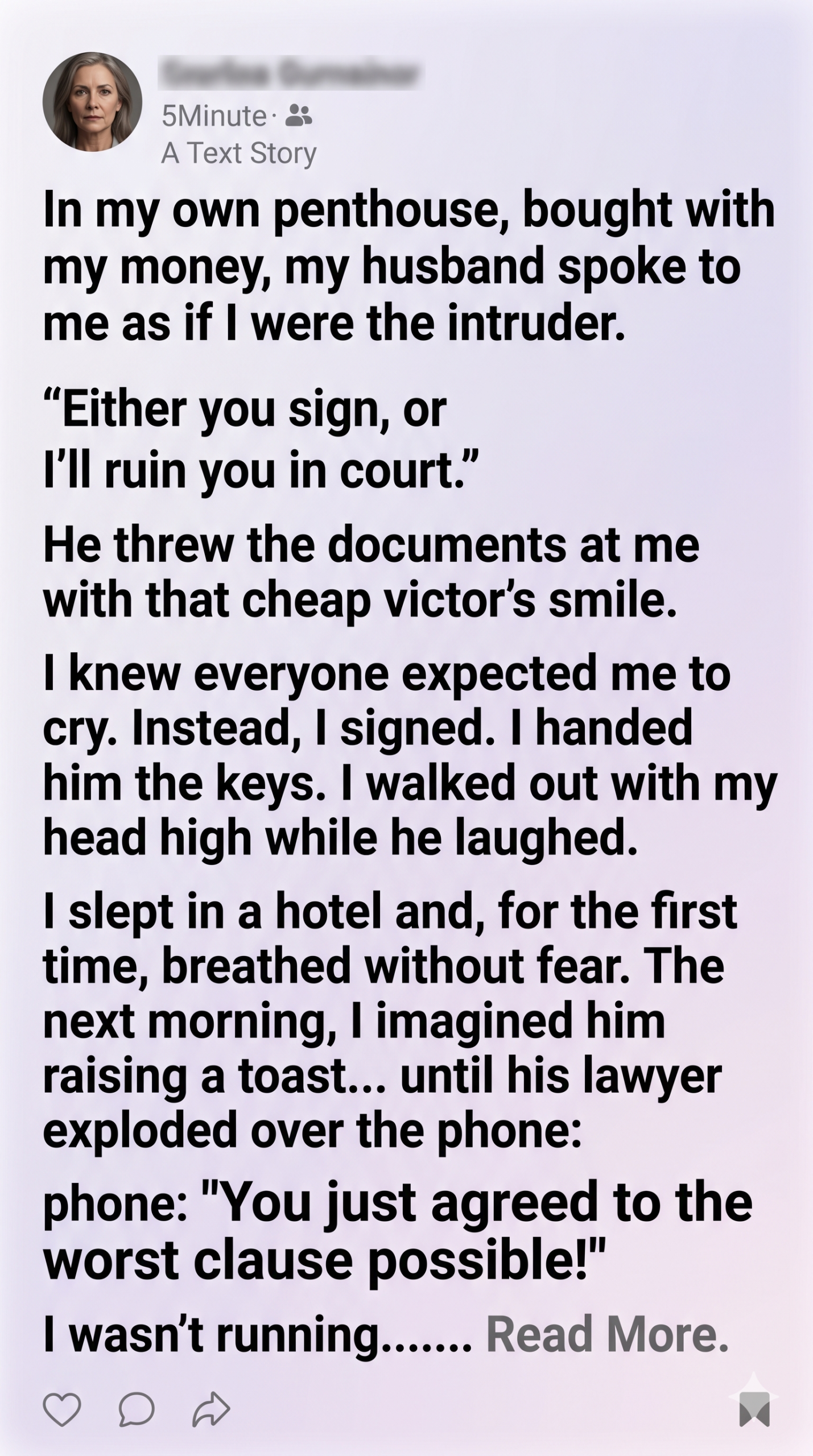 In my own penthouse, bought with my money, my husband spoke to me as if I were the intruder. “Either you sign, or I’ll ruin you in court.” He threw the documents at me with that cheap victor’s smile. I knew everyone expected me to cry. Instead, I signed. I handed him the keys. I walked out with my head high while he laughed. I slept in a hotel and, for the first time, breathed without fear. The next morning, I imagined him raising a toast… until his lawyer exploded over the phone: “You just agreed to the worst clause possible!” I wasn’t running away. I was closing a trap.
