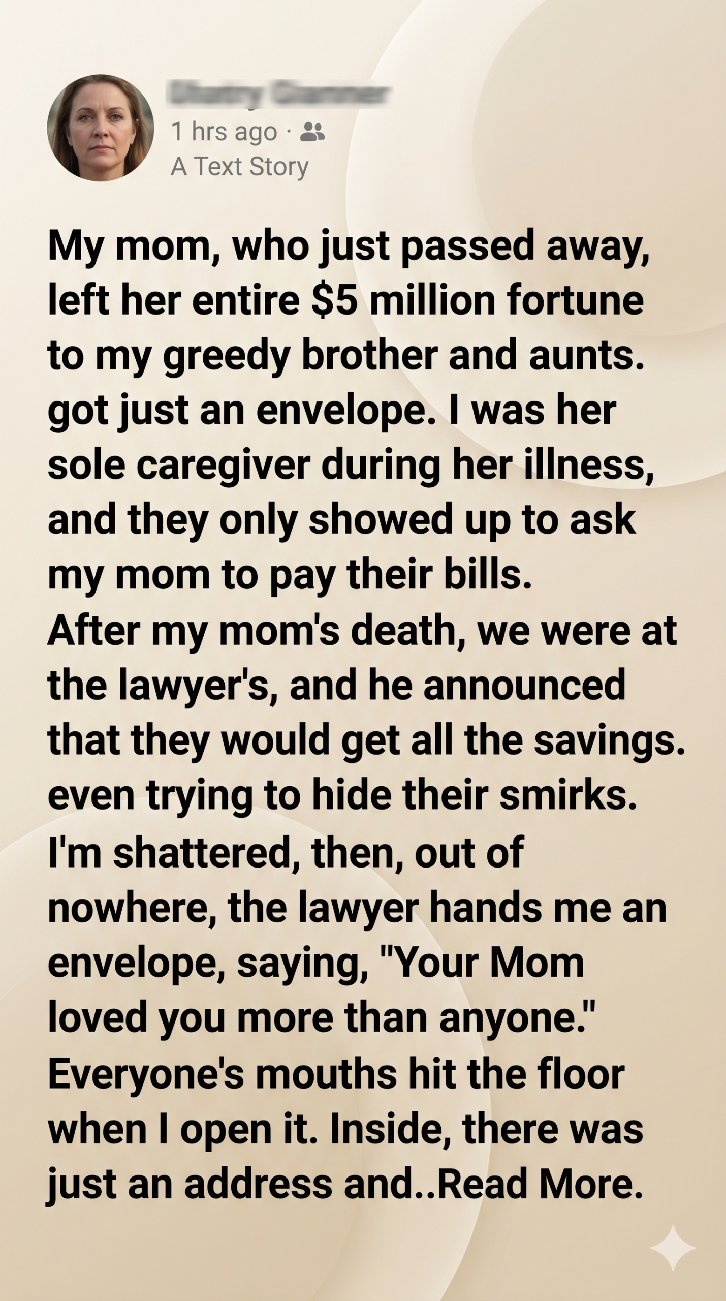 The lawyer cleared his throat, adjusting his spectacles. “And for you,” he said, his voice devoid of warmth, “your mother left… this.” He pushed a plain, cream-colored envelope across the polished mahogany table. No dramatic reveal, no explanation. Just a small, unassuming envelope. That was it.
