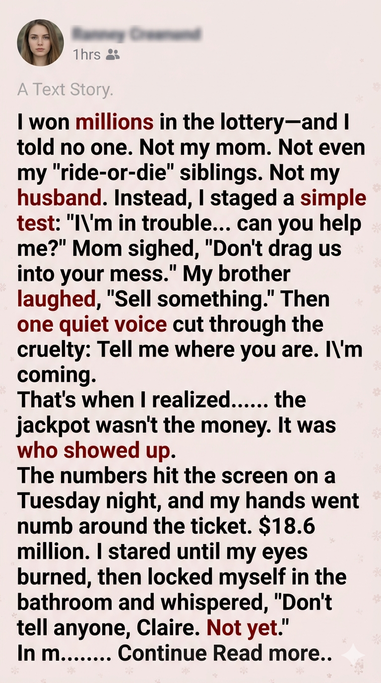 I won millions in the lottery—and I told no one. Not my mom. Not even my “ride-or-die” siblings. Not my husband. Instead, I staged a simple test: “I’m in trouble… can you help me?” Mom sighed, “Don’t drag us into your mess.” My brother laughed, “Sell something.” Then one quiet voice cut through the cruelty: “Tell me where you are. I’m coming.” That’s when I realized… the jackpot wasn’t the money. It was who showed up.